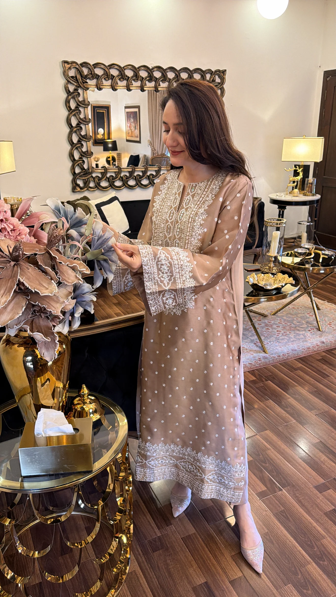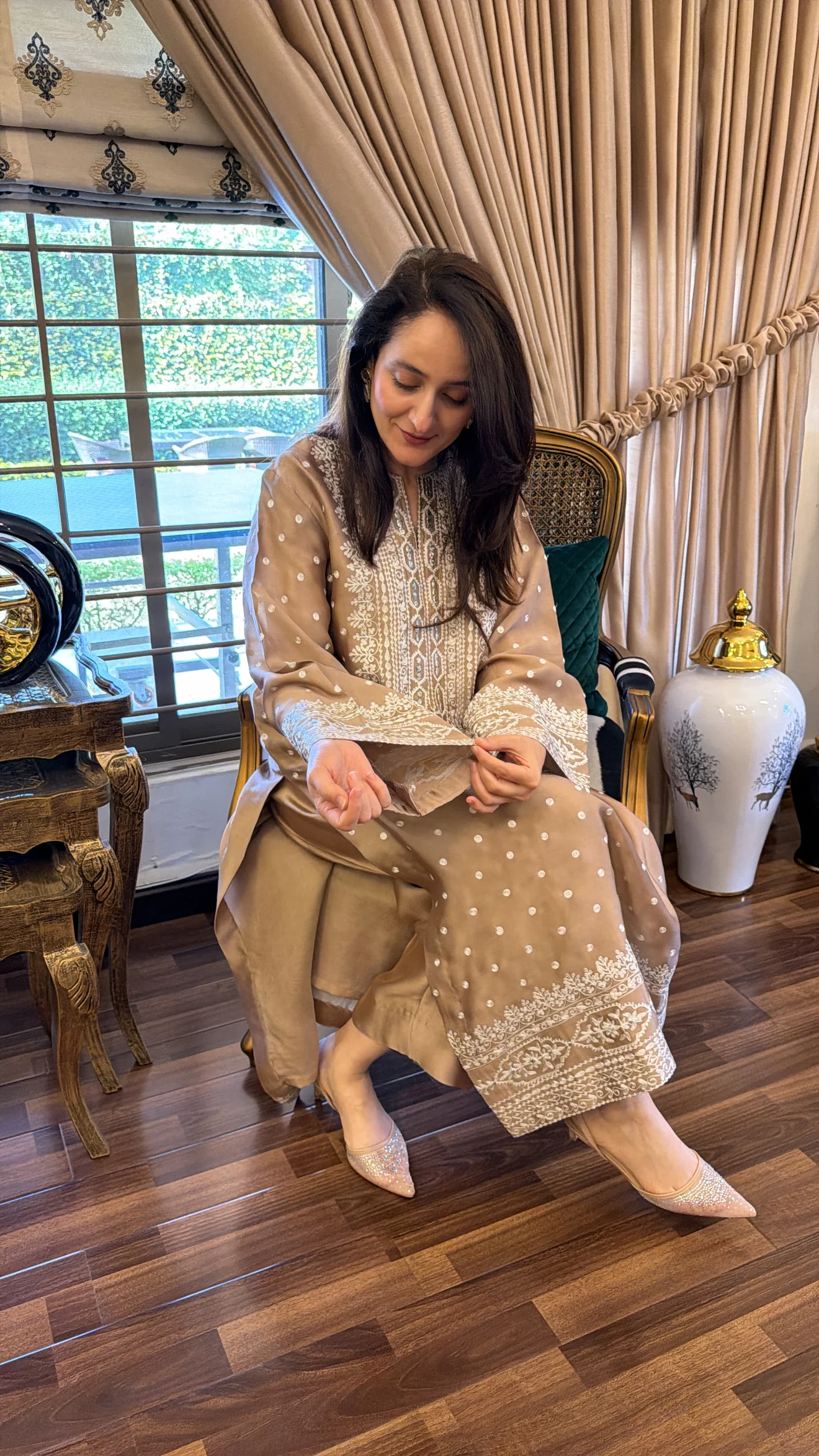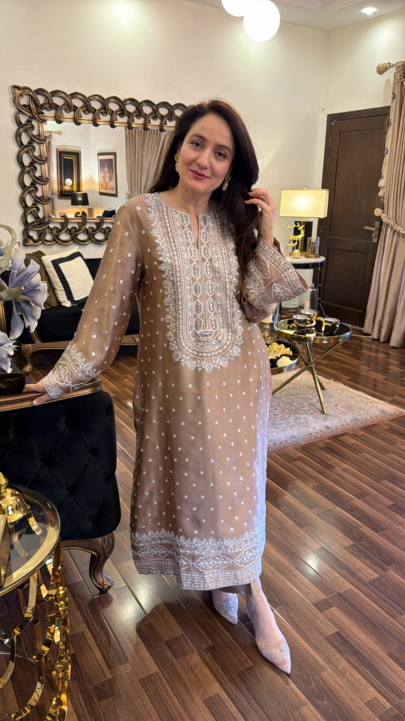 Effortless elegance meets traditional craftsmanship. This ensemble is designed for the woman who appreciates understated glamour. Crafted from high-quality Chanderi silk, the shirt features a rich, earthy taupe hue that serves as the perfect canvas for the intricate ivory embroidery. The flared sleeves and structured neckline provide a modern twist to a classic outline, making it an ideal choice for intimate gatherings, festive dinners, or high-tea events. Each piece is custom-stitched to ensure a flawless fit, reflecting the bespoke quality of the Amna Omar Collection.